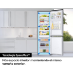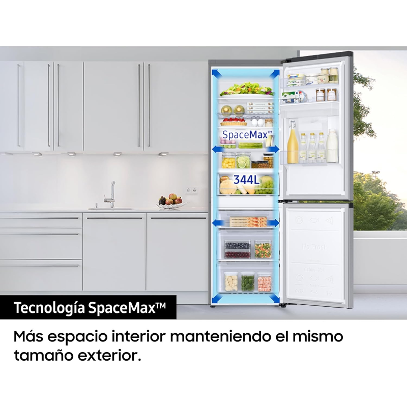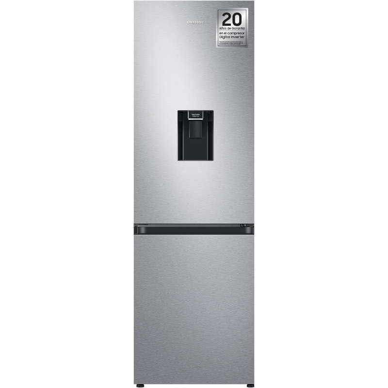 Frigorífico combi No Frost Samsung RB34C632DSA/EF con capacidad neta total de 344 L. Configuración con compartimento de refrigeración y compartimento de congelación independientes, con puertas separadas y congelador ubicado en la parte inferior. Sistema de refrigeración No Frost (sin formación de escarcha) y control electrónico de temperatura. Incorpora compresor Digital Inverter y sistema All-Around Cooling para la circulación del aire en el interior. El compartimento frigorífico incluye estantes y balcones en puerta para organización de alimentos y bebidas, además de cajones para productos frescos. El congelador dispone de cajones extraíbles para almacenamiento de alimentos congelados. Diseño de libre instalación. Marca: Samsung. Modelo: RB34C632DSA/EF.