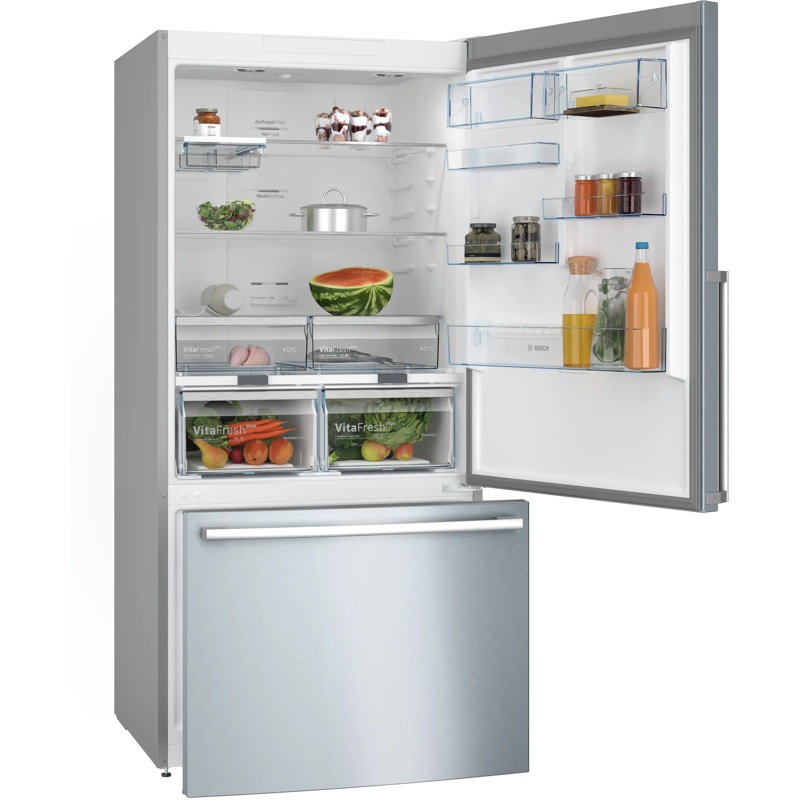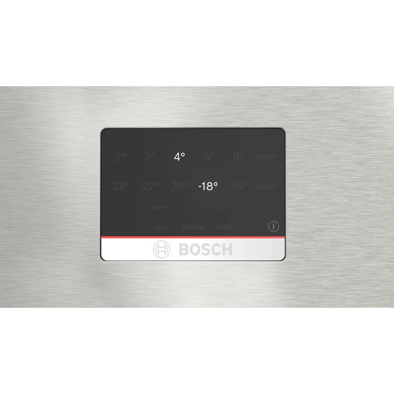 Frigorífico combi Bosch KGB86XIEP de libre instalación con volumen total de 631 L distribuido entre compartimento frigorífico de 479 L y compartimento congelador de 152 L. Clase de eficiencia energética E según la clasificación europea dentro del rango de A a G. Dimensiones de 186 cm de altura, 86 cm de anchura y 81 cm de profundidad. Sistema de frío No Frost. Nivel de ruido de 40 dB(A) re 1 pW. Configuración vertical con compartimentos independientes para refrigeración y congelación accesibles mediante puertas frontales. El interior incluye estantes, cajones y compartimentos destinados a la organización de alimentos refrigerados y productos congelados. Funcionamiento mediante conexión a red eléctrica doméstica. Configuración destinada a instalación independiente en espacios para electrodomésticos de refrigeración. Estructura exterior con acabado en acero inoxidable.