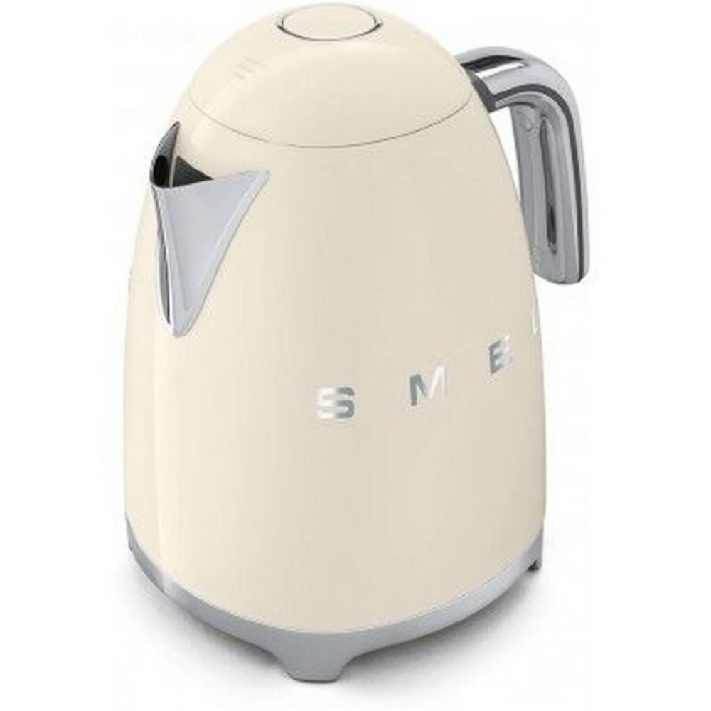 Hervidor eléctrico Smeg KLF03CREU con capacidad de 1,7 L y potencia de 2400 W. Cuerpo de acero inoxidable con indicador de nivel de agua y graduación en litros y tazas. Incorpora resistencia oculta, base giratoria de 360° y filtro extraíble de acero inoxidable. Dispone de apagado automático al alcanzar 100 °C, al detectar ausencia de agua o al retirarse de la base. Tapa con apertura mediante pulsador, recogecable integrado en la base y alimentación de 220-240 V con frecuencia de 50/60 Hz. Medidas aproximadas: 24,8 × 22,6 × 17,1 cm.