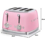 La tostadora Smeg TSF03PKEU es un modelo de 4 ranuras con potencia de 2000 W. Dispone de 2 paneles de control, cada uno con mando, palanca de activación y teclas de función, para gestionar dos pares de ranuras por separado. Incorpora 6 niveles de tostado y funciones de recalentamiento, descongelación y bagel. Las ranuras cuentan con sistema de centrado automático y mecanismo de expulsión automática al finalizar el ciclo. El cuerpo está fabricado en acero, con base y detalles en acero inoxidable y elementos de mando en plástico. Incluye 2 bandejas recogemigas extraíbles de acero inoxidable y pies antideslizantes. La anchura de cada ranura es de 36 mm. Funciona con alimentación de 220-240 V, frecuencia de 50/60 Hz y enchufe europeo.
